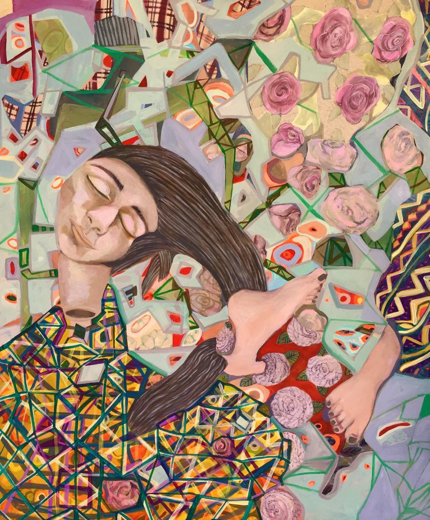 Straight hair hasta en el Malecón, Acrylics on fabric, 25”X 19”.