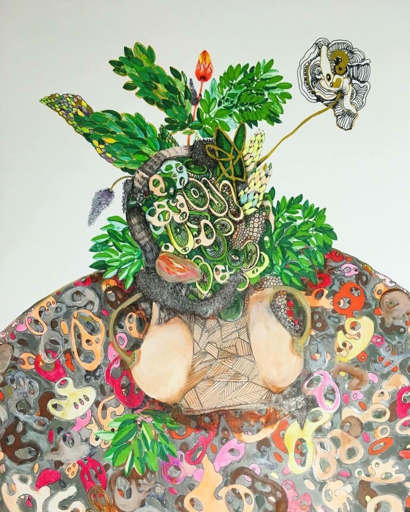 Vasija and a Caribbean background, Acrylics on fabric 36”X 30”,